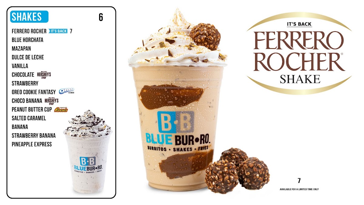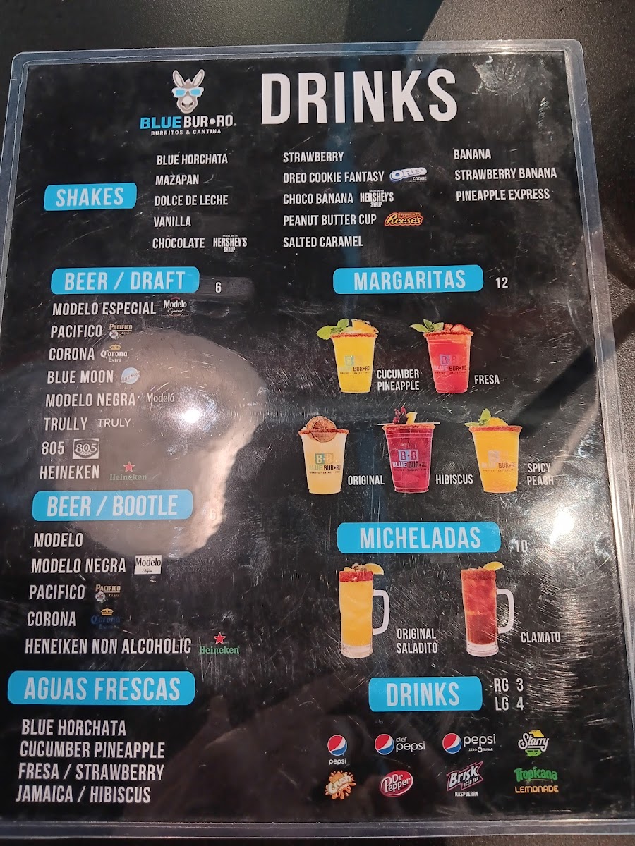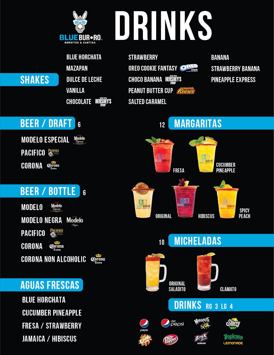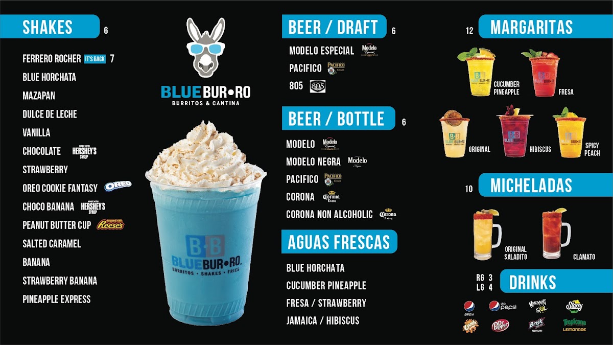 Drinks at Blue Burro are just as enticing as the food; don't miss out on their mouthwatering milkshakes, available in flavors like Salted Caramel and Dulce De Leche, each priced at $6.00. For something a bit different, indulge in the Banana Split Shake at $7.50, a creamy blend that's sure to satisfy your sweet tooth.